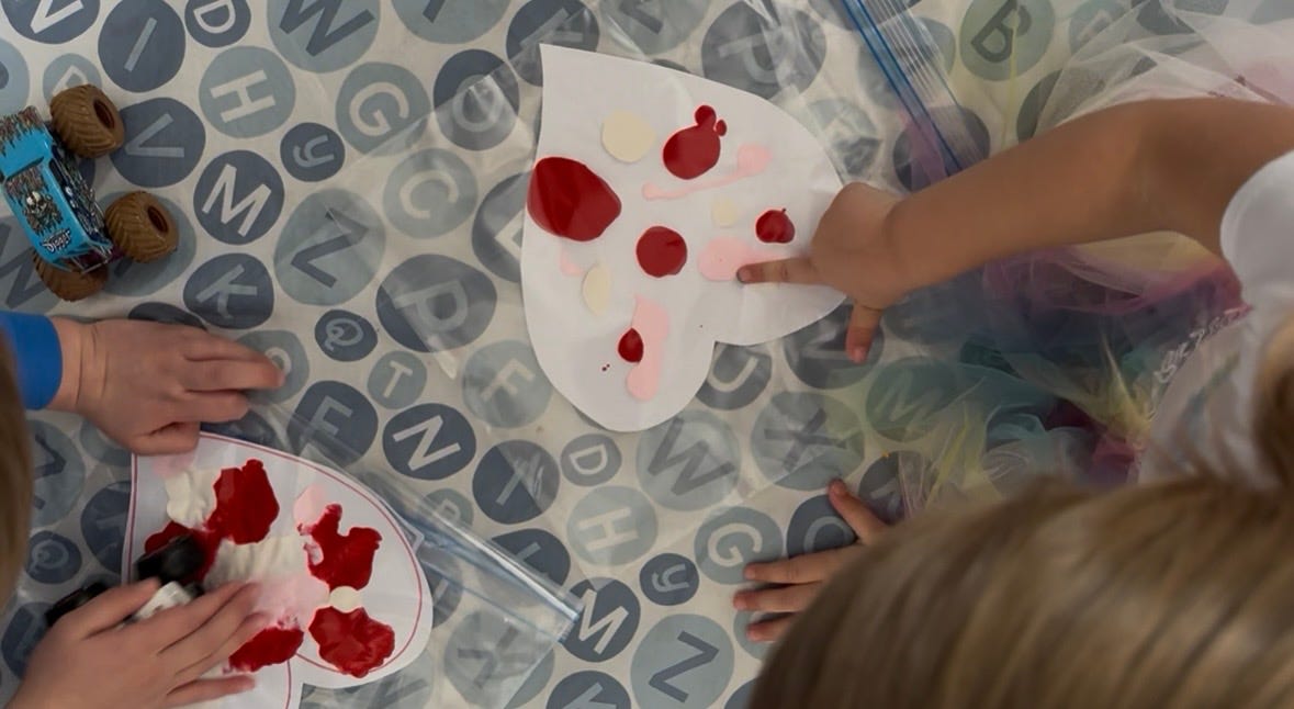 Mess-less paper hearts with red, white, and pink acrylic paints sealed inside a Ziploc bag? A jackpot activity, right?