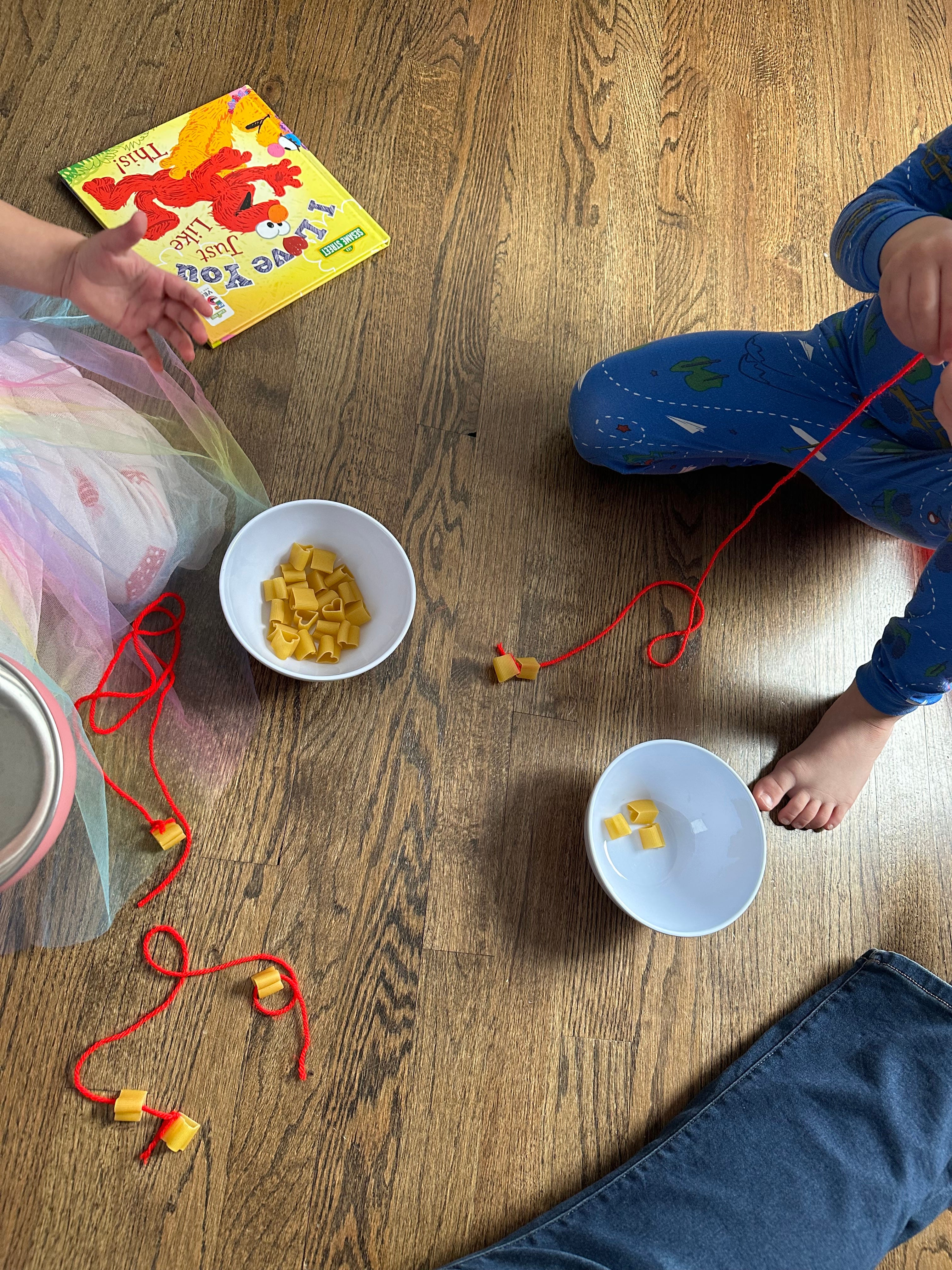When I finally had some free time at home with McQueen and Baby McQueen, I thought Valentine’s Day–themed art projects would be a hit. I set up a heart-shaped pasta necklace–stringing station. I had even special-ordered the pasta weeks ago in anticipation of this very moment.